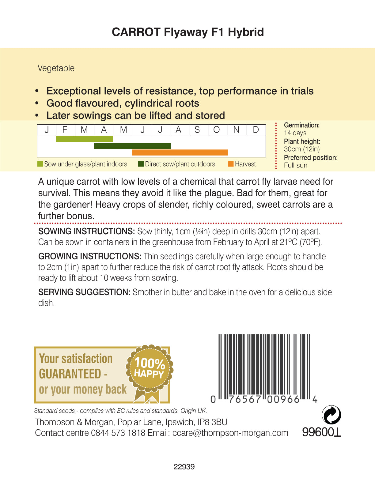 A unique carrot with low levels of a chemical that carrot fly larvae need for survival. This means they avoid it like the plague. Bad for them, great for the gardener! Heavy crops of slender, richly coloured, sweet carrots are a further bonus.
