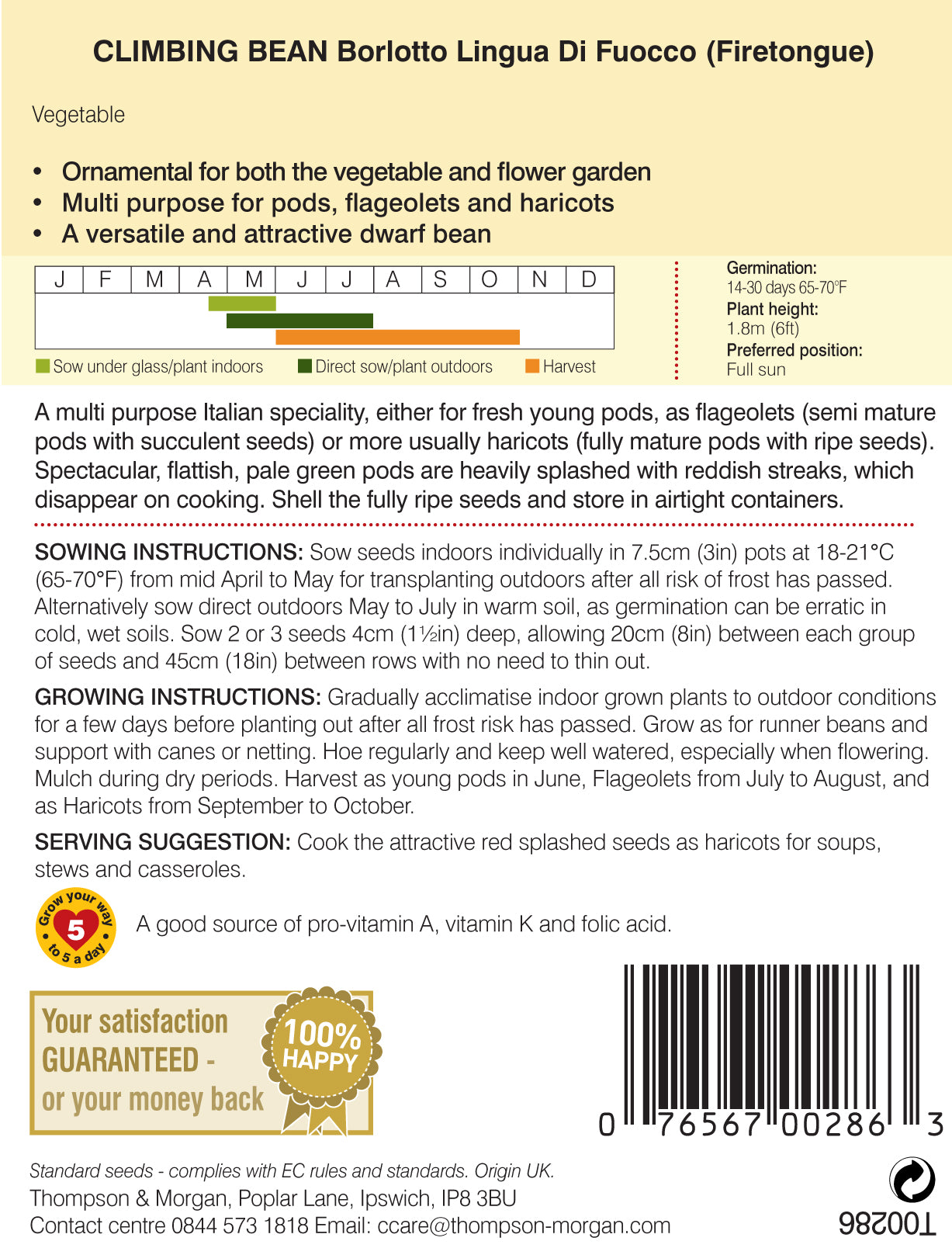 A multi-purpose Italian speciality, either for fresh young pods as flageolets (semi-mature pods with succulent seeds) or more usually as haricots (full mature pods with ripe seeds). Spectacular, flattish, pale green pods are heavily splashed with reddish streaks which disappear on cooking.