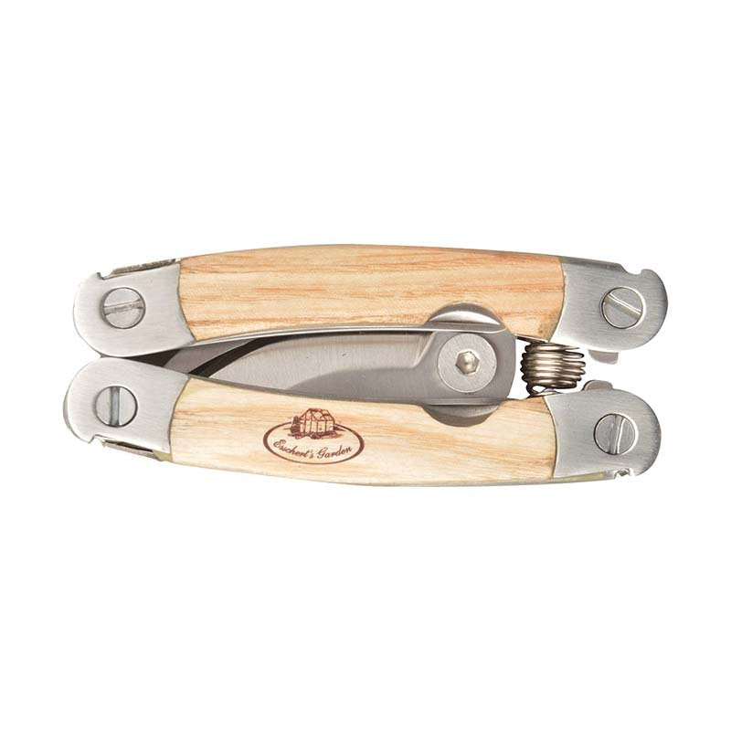 This compact multi-tool can be used for a variety of jobs in and around the garden. It comes with 5 tools, including a hook to remove roots (with blade on the crosscut side), pruning knife, pruning shears with safety, taproot dibber and a wood saw. This multi-tool was made with sturdy stainless steel in combination with European ash wood. Its compact and small size allows you to take it anywhere with ease.