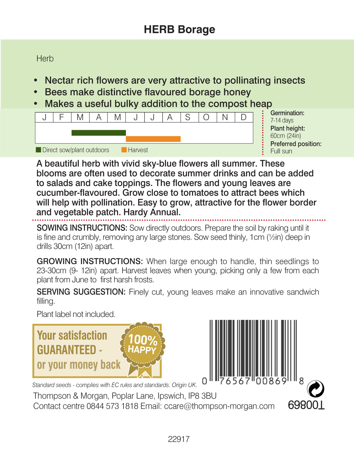 A beautiful hardy annual herb with rough leaves covered in silvery hairs and the most attractive celestial blue flowers. Nectar rich borage flowers are particularly attractive to pollinating insects, including bees which make distinctive flavoured borage honey. This versatile upright herb has a multitude of uses - add the cucumber flavoured leaves to summer drinks and salads, grow it as a companion plant close to other crops to attract pollinating insects, and at the end of the season plants make a useful bulky addition to the compost. Height: 60cm (24"). Spread: 45cm (18").