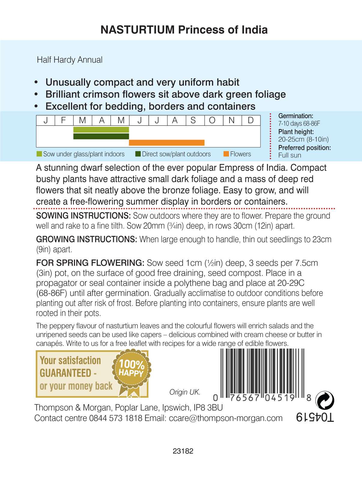 A stunning dwarf selection of the ever popular Empress of India. Compact bushy plants have attractive small dark foliage and a mass of deep red flowers that sit neatly above the bronze foliage.