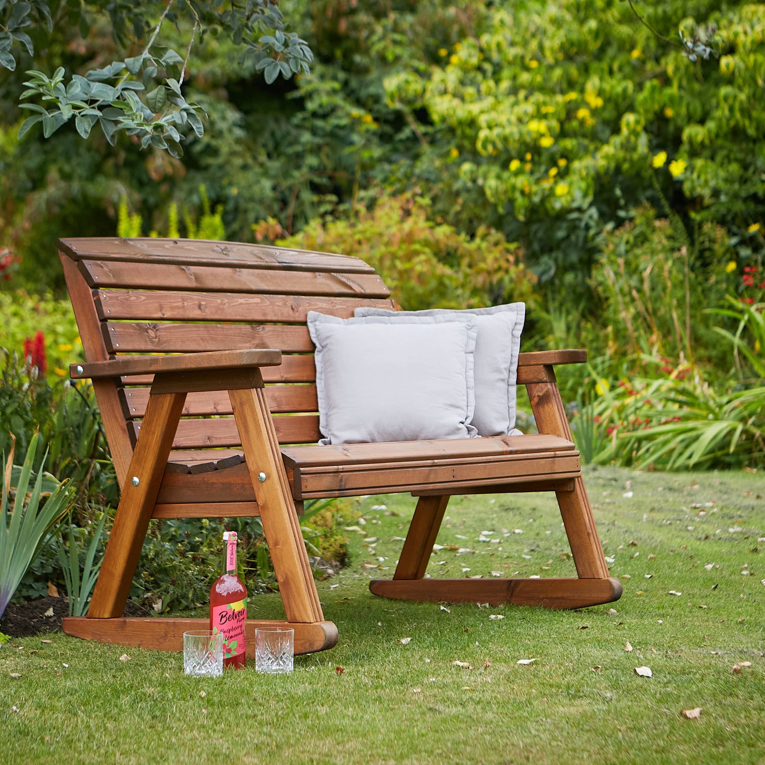 Lovely rocking bench, the perfect seat to unwind in. Shaped for extra comfort. Finished in a rustic wood stain that gives off a classic look. Made from FSC® Timber.